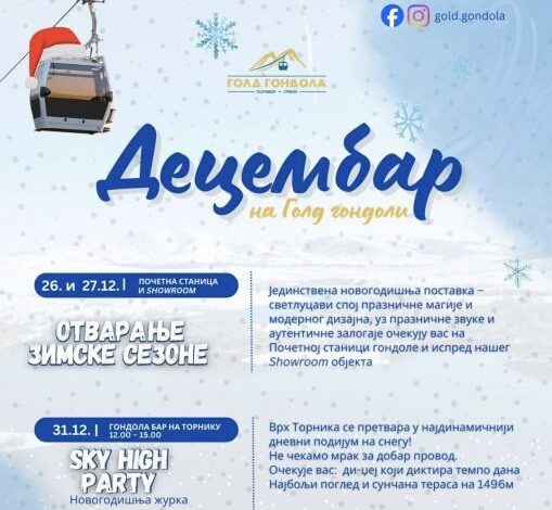 Gold gondola Zlatibor privodi kraju sve pripreme za početak zimske sezone, koja će zvanično početi u petak, 26. decembra. Tim povodom, na početnoj stanici i u centru Zlatibora posetioce očekuje praznično raspoloženje uz raznovrsne animacije i degustacije.