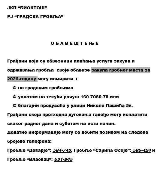 Radi uspešnijeg sprovođenja programa odnošenja otpada, RJ “Gradska čistoća” JKP Bioktoš je apelovala na građane, vozače, da izbegavaju nepropisno parkiranje u sledećim ulicama: