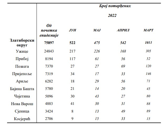 – Užice ima 20 novoobolelih, Nova Varoš -5, Priboj – 4, Bajina Bašta – 2, Požega – 2, Čajetina – 2, Arilje – 1, Kosjerić – 1, Prijepolje – 1 i Sjenica – 1. Od početka epidemije do danas ukupno je potvrđeno 75897 slučajeva infekcije korona virusom kovid-19 na teritoriji Zlatiborskog okruga, naveli su iz Zavoda za javno zdravlje Užice.