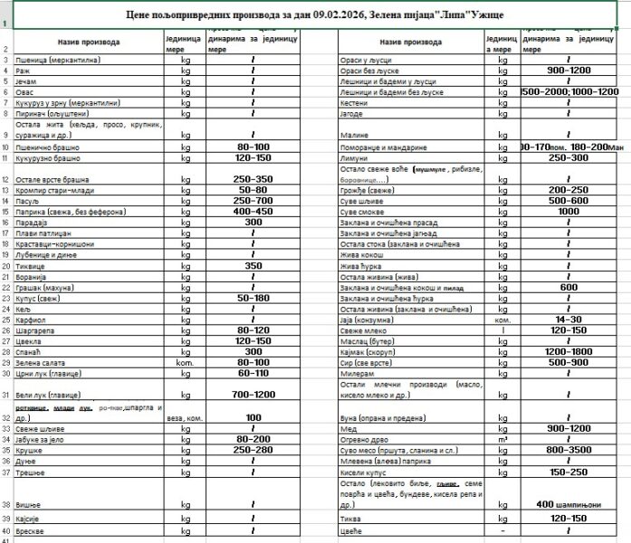 Početna Zlatiborski okrug Užice Cene na užičkom pijacu Zlatiborski okrugUžice 9. februar 2026. Objavljeno: 25 minuta ranije Cene na užičkom pijacu Autor: RadioLuna Podelite Facebook Twitter Pinterest WhatsApp - REKLAMA - Foto screenshot obaveštenja JKP Bioktoš Za pokriće potrošačke korpe u avgustu bilo potrebno 1,04 prosečne zarade - Advertisement - TagsceneJKP Bioktošpijaczelena pijaca Lipa Podelite Facebook Twitter Pinterest WhatsApp RadioLunahttps://www.radioluna.info - REKLAMA - Vremenska prognoza Užice overcast clouds enter location 5.7 ° C 5.7 ° 5.7 ° 93 % 1.4kmh 100 % Pon 6 ° Uto 7 ° Sre 12 ° Čet 12 ° Pet 7 ° Poslednje vesti EKO Rešenje za otpadne vode u Mačkatu: Opština Čajetina najavljuje novo postrojenje RadioLuna - 9. februar 2026. - REKLAMA - Dijalog Svet Komisija objavila smernice za zaštitu medijskih sadržaja na onlajn platformama 7. februar 2026. Užice Opozicioni odbornici uz građansku inicijativu „Ujedinjeni za Sevojno“ 7. februar 2026. Srbija i region Održana prva sednica Komisije za reviziju biračkog spiska 5. februar 2026. Poslednje vesti EKO Rešenje za otpadne vode u Mačkatu: Opština Čajetina najavljuje novo postrojenje 9. februar 2026. Trendovi Za pokriće potrošačke korpe u avgustu bilo potrebno 1,04 prosečne zarade 9. februar 2026. Trendovi NSZ: U Srbiji u decembru 339.187 nezaposlenih, skoro 14.000 manje nego pre godinu dana 9. februar 2026. Užice Sistematski pregledi pred upis đaka prvaka 9. februar 2026. Srbija i region MUP u kontroli saobraćaja u sklopu međunarodne akcije ROADPOL 9. februar 2026. - REKLAMA - Postavite komentar otkaži odgovor Unesite Vaš komentar! molimo Vas unesite Vaše ime Vi ste uneli pogrešnu Email-Adresu molimo Vas unesite Vašu Email-Adresu Save my name, email, and website in this browser for the next time I comment. Δ