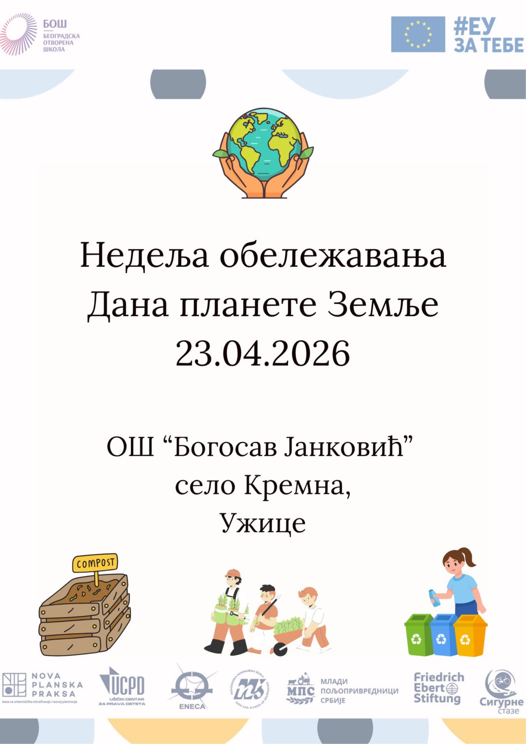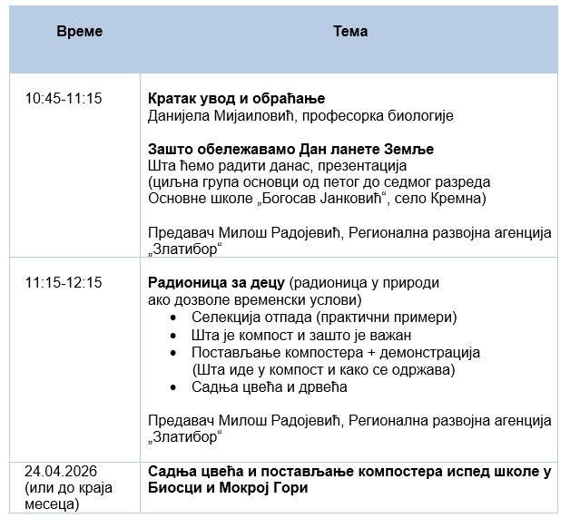 Povodom obeležavanja Dana planete Zemlje, u Osnovnoj školi „Bogosav Janković“ u Kremnima 23. aprila biće organizovana edukativna ekološka radionica za učenike od petog do sedmog razreda sa ciljem da se kod najmlađih razvija ekološka svest i odgovoran odnos prema prirodi.