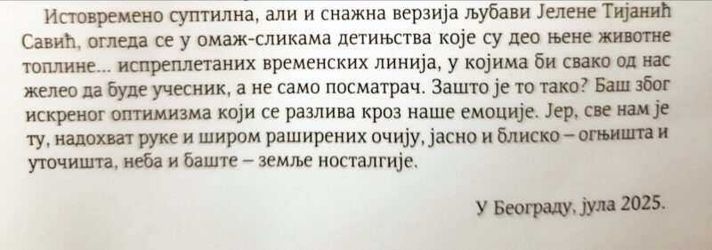 „Odavno sam želela da se predstavim svom gradu i da vidim ljude sa kojima sam, praktično, odrastala i delila najlepše trenutke. Sama tematika izložbe je nostalgija, vraćanje u prošle dane, pa se nadam da će se svako od vas pronaći“, kazala je umetnica u gradu u kom je provela detinjstvo.