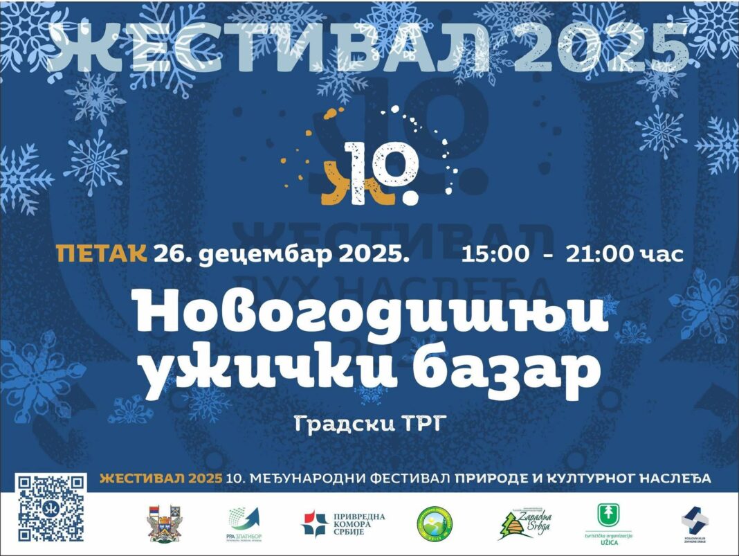 Novogodišnji užički bazar, biće održana danas, od 15 do 21 čas, na gradskom trgu u Užicu, a okviru 10. Međunarodnog festivala prirode i kulturnog nasleđa Žestival.