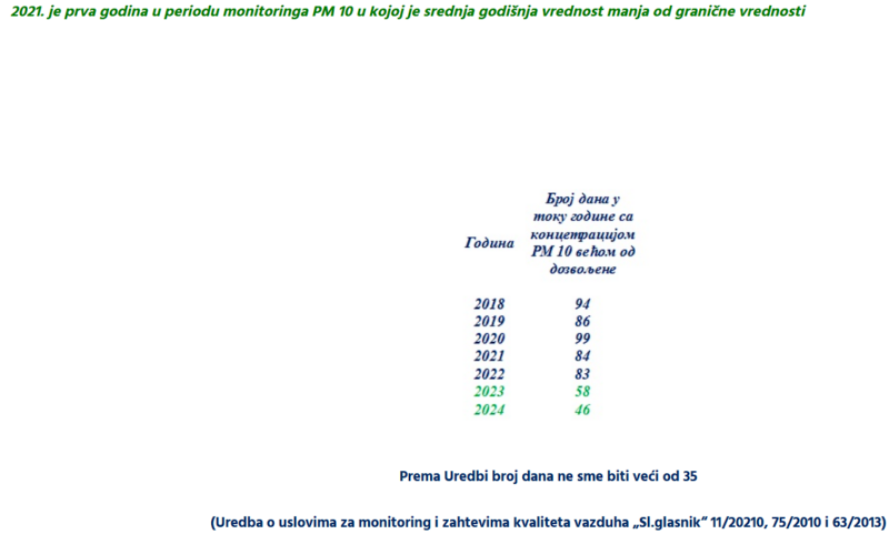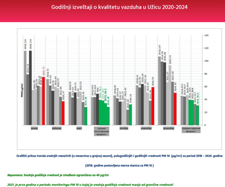 U Izveštaju o stanju životne sredine u Gradu Užicu za 2024.godinu, Odeljenja za zaštitu životne sredine i održivi razvoj, navedeno je da je „prema kriterijumu ocenjivanja kvaliteta vazduha, prekoračenje zabeleženo u broju dana sa prekoračenim vrednostima dnevnih dozvoljenih vrednosti PM10 46 od maksimalno dozvoljenih 35, što je manje u odnosu na 2023.godinu kad je broj dana sa prekoračenjem graničnih vrednosti bio 58“.