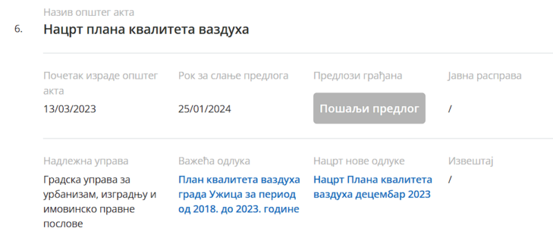 Grad Užice je 2015. godine doneo Kratkoročni akcioni plan zaštite kvaliteta vazduha za teritoriju grada Užica, a rukovodi se i Planom kvaliteta vazduha grada Užica 2018-2023.godine, dok i dalje čeka usvajanje nacrta novog plana kvaliteta vazduha sa akcionim planom.