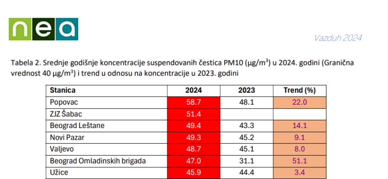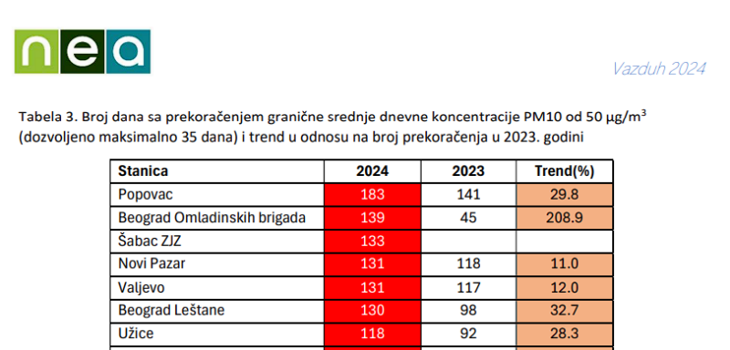 Nacionalna ekološka asocijacija je objavila svoj izveštaj o kvalitetu vazduha za 2024. godinu koji sadrži analize i ocene stanja vazduha u mestima u Srbiji sa državnim automatskim monitoringom kvaliteta vazduha.