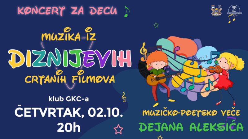 U četvrtak 2. oktobra sa početkom u 20 časova u Klubu Gradskog kulturnog centra najmlađi Užičani uživaće u muzici iz Diznijevih crtanih filmova u okviru muzičko-poetske večeri Dejana Aleksića, jednog od najistaknutijih mlađih predstavnika srpske pesničke scene koji veoma uspešno objavljuje književna dela za decu.