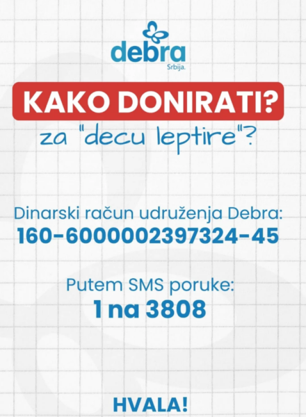 Građani koji žele da pomognu mogu to učiniti slanjem SMS poruke sadržaja 1 na broj 3808, kao i uplatom na devizni račun udruženja Debra: 160-6000002397324-45.
