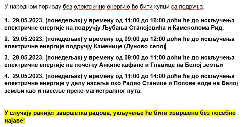 Iz užičkog EPS su najavili da će zbog planiranih radova danas do 16 časova bez električne energije biti potrošači na području Bešlića, Dugog Dola i Nikolića u Kremnima, Mećavnika, Ž. Stanice, Kotromana i Brane Bela Stena u Mokroj Gori.