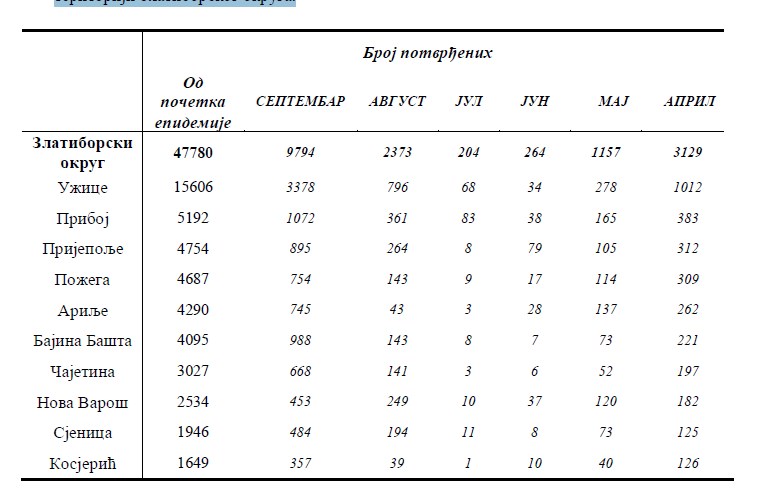 – Užice ima 66 novoobolelih, Arilje – 30, Prijepolje – 26, Nova Varoš i Priboj po 22, Kosjerić – 20, Požega– 18, Bajina Bašta – 13, Čajetina – 11 i Sjenica devet, naveli su iz ZZJZ Užice broj novih potvrđenih slučajeva kovid-19.