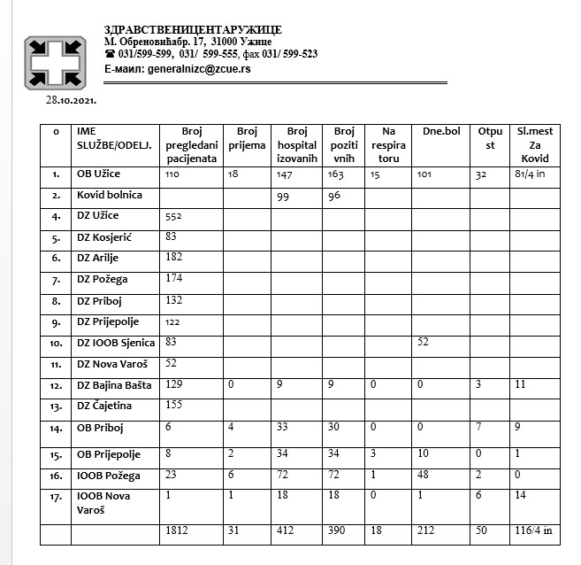 Prema podacima Zdravstvenog centra Užice, od 412 hospitalizovanih u Zlatiborskom okrugu, 390 pacijenata ima korona virus kovid-19.