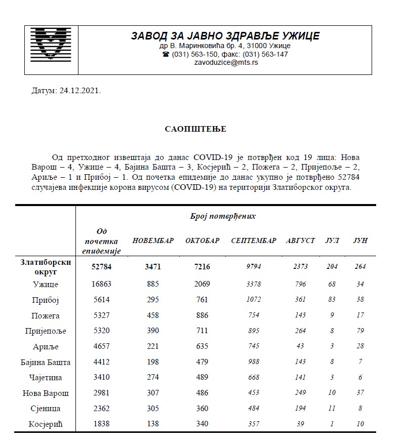 Užice i Nova Varoš beleže po četiri novoobolela, Bajina Bašta – 3, Kosjerić, Požega, Prijepolje po dva nova slučaja kovid-19, Arilje i Priboj po 1.