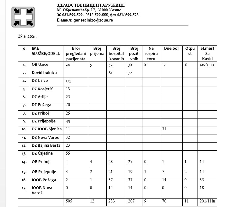 Iz Zdravstvenog centra Užice su izvestili da je na lečenju u bolnicama u Zlatiborskom okrugu 233 pacijenata, od kojih je kod 207 potvrđen korona virus kovid-19.
