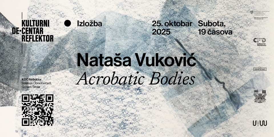 Kulturni de-centar Reflektor otvoriće samostalnu izložbu „Acrobatic Bodies“, autorke Nataše Vuković, 25. oktobra u 19 časova. Ulaz je slobodan.