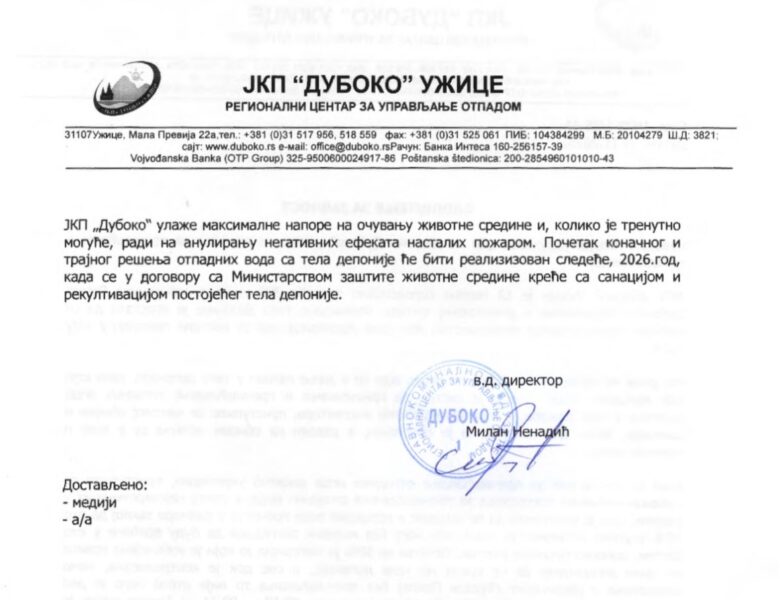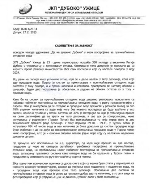 JKP „Duboko“ oglasilo se saopštenjem povodom navoda Udruženja građana „Da (Ne) Dišemo Duboko“ u vezi sa radom postrojenja za prečišćavanje otpadnih voda na ovoj deponiji.