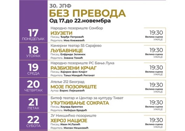 Drugog dana 30. Jugoslovenskog pozorišnog festivala „Bez prevoda“ izvedena je predstava Ljubavnice, po tekstu austrijske književnice i dobitnice Nobelove nagrade za književnost, Elfride Jelinek, u režiji Jovane Tomić.