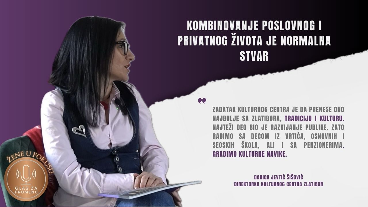 Mnogi ljudi čitav radni vek provedu radeći posao koji ne vole. Većina nema ni hrabrosti ni mogućnosti da nešto promeni, da se osnaži i krene u nove izazove. Danica Jevtić Šišović nije osoba iz te priče. Nikada nije živela u zoni komfora već je težila da svoje unutrašnje potrebe, hobije, duhovne i kulturne interese ostvari kroz posao koji radi s punom strašću. Kao slikarka, majka, supruga i direktorka Kulturnog centra Zlatibor, Danica živi ono što radi.