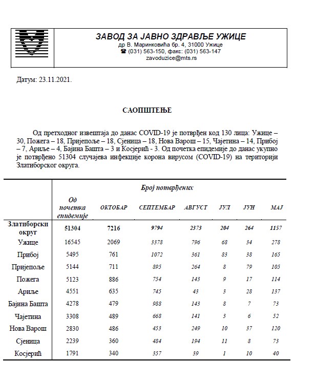Početna Koronavirus Korona potvrđena kod 130 ljudi Koronavirus 23. novembar 2021. Korona potvrđena kod 130 ljudi Autor: RadioLuna Podelite Facebook Twitter Pinterest WhatsApp - REKLAMA - Kod ukupno 130 ljudi u Zlatiborskom okrugu je potvrđen korona virus kovid-19, prema poslednjem izveštaju Zavoda za javno zdravlje Užice. - Advertisement - Podelite Facebook Twitter Pinterest WhatsApp RadioLunahttps://www.radioluna.info - REKLAMA - Vremenska prognoza Užice few clouds enter location 9 ° C 9 ° 9 ° 74 % 0.6kmh 12 % Uto 10 ° Sre 14 ° Čet 15 ° Pet 16 ° Sub 17 ° Poslednje vesti Sport Deca uglavnom na klupama i u kućama, inkluzija na papiru (AUDIO) Jelena Penezić - 11. novembar 2025. - REKLAMA - Dijalog Svet Evropska komisija u izveštaju o Srbiji: Polarizacija društva produbljena, reforme usporene 5. novembar 2025. Društvo Godišnjica pada nadstrešnice u Novom Sadu, još bez sudskog postupka 1. novembar 2025. Srbija i region Pravedna tranzicija u Srbiji – bez plana, inkluzivnosti i namenskih fondova 24. oktobar 2025. Poslednje vesti Sport Deca uglavnom na klupama i u kućama, inkluzija na papiru (AUDIO) 11. novembar 2025. Sport Veljko Vasiljević u sastavu Srbije na Prvenstvu Balkana u krosu 11. novembar 2025. Društvo MUP upozorava na lažne poruke i mejlove 11. novembar 2025. Svet UNHCR: Milioni ljudi širom sveta napuštaju domove zbog klimatskih promena 11. novembar 2025. Zlatibor/Čajetina Turistička organizacija Zlatibor učestvovala na konferenciji „Food Talk Podgorica“ 11. novembar 2025. - REKLAMA - Postavite komentar otkaži odgovor Unesite Vaš komentar! molimo Vas unesite Vaše ime Vi ste uneli pogrešnu Email-Adresu molimo Vas unesite Vašu Email-Adresu Save my name, email, and website in this browser for the next time I comment. Δ