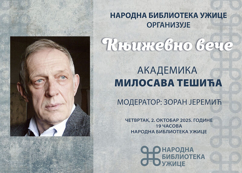 Književno veče akademika Milosava Tešića biće održano 2. oktobra u 19 časova, u Narodnoj biblioteci Užice. Moderator je Zoran Jeremić, a program se organizuje u okviru proslave Dana grada Užica.