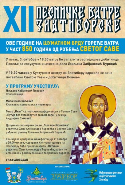 Manifestacija „Pesničke vatre zlatiborske“ biće održana 3. oktobra, u znaku obeležavanja 850 godina od rođenja Svetog Save. Centralni program biće upriličen u petak, 3. oktobra, na Zlatiboru.
