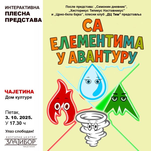 Interaktivna plesna dečja predstava ,,Sa elementima u avanturi” biće izvedena u petak, 3. oktobra u Domu kulture u Čajetini, a u subotu 4. oktobra, u Kulturnom centru na Zlatiboru, obe u u 18 časova.
