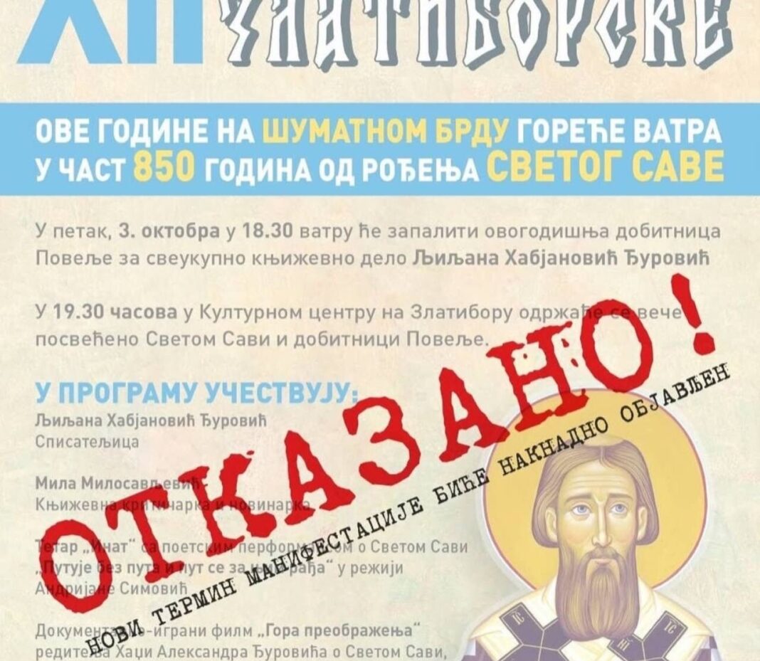Opština Čajetina i Kulturni centar Zlatibor saopštili su da je manifestacija „Pesničke vatre zlatiborske“ otkazana usled nepovoljnih vremenskih prilika.