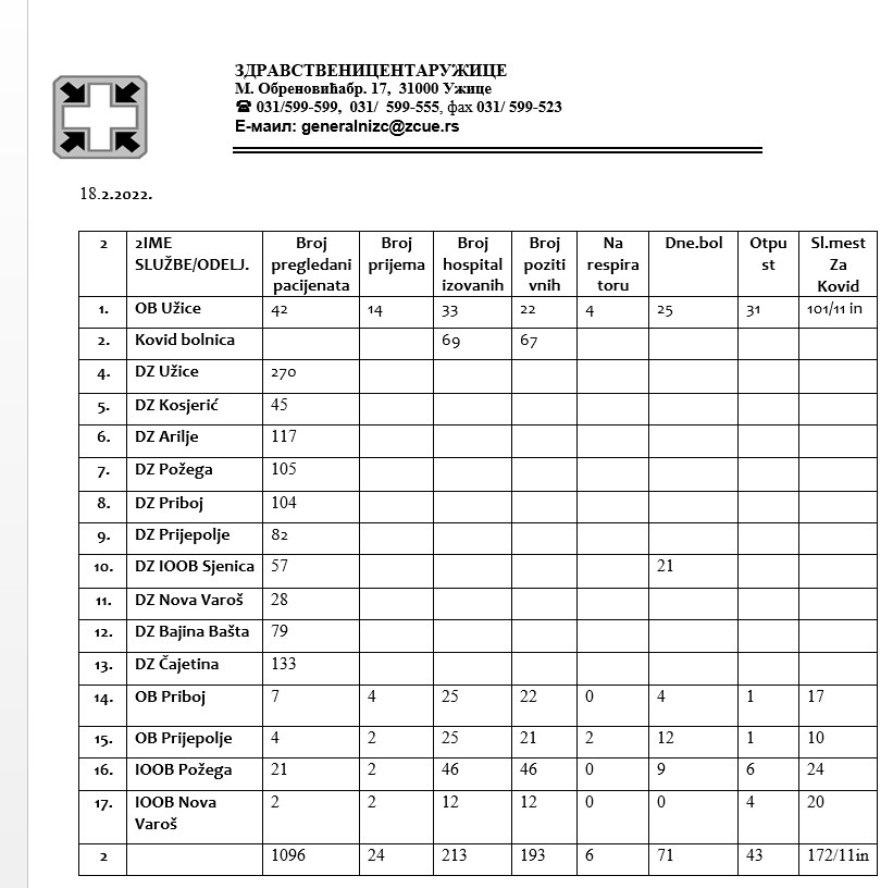 Ukupno je šest hospitalizovanih u užičkoj i prijepoljskoj bolnici na respiratoru, što je za tri manje nego prethodnog dana.