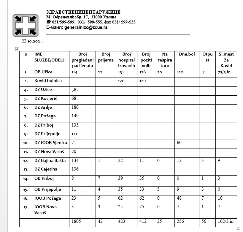Prema izveštaju Zdravstvenog centra Užice, od 423 pacijenata na bolničkom lečenju u okrugu, 412 ima korona virs kovid-19.