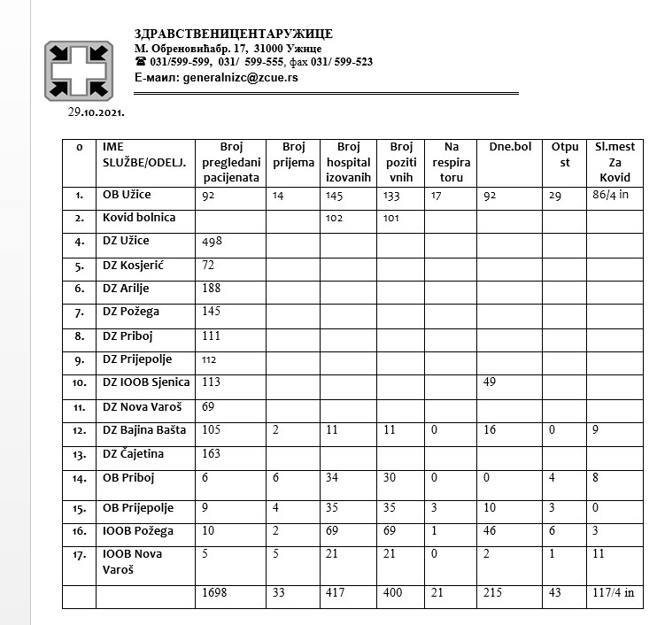 Na respiratoru u bolnicama u Užicu, Prijepolju i Požegi je 21 pacijent, dok ih je prethodnog dana bilo 18 životno ugroženih.
