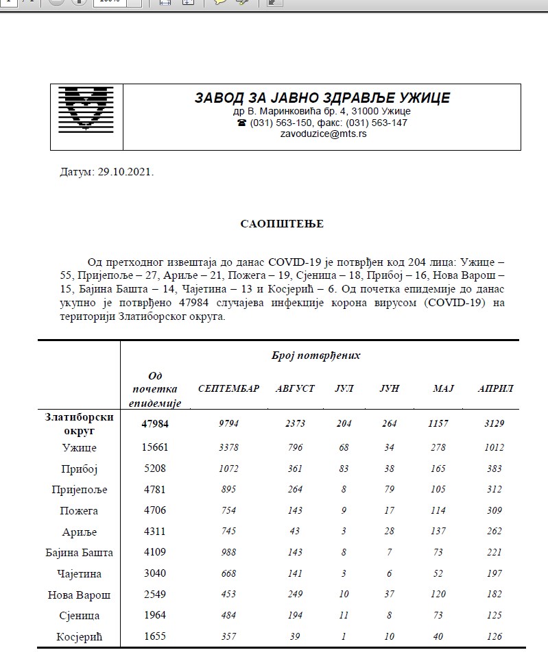 Korona virus kovid-19 je potvrđen kod 204 ljudi u Zlatiborskom okrugu, prema poslednjem dnevnom izveštaju Zavoda za javno zdravlje Užice.