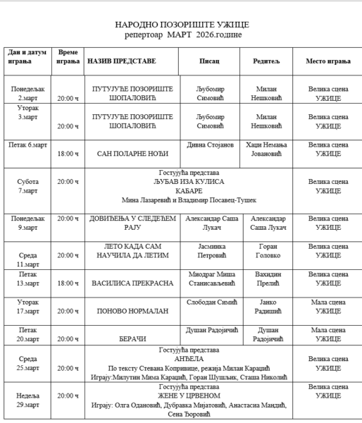 Početna Zlatiborski okrug Užice Mart u Narodnom pozorištu Zlatiborski okrugUžiceNaslovna 26. februar 2026. Objavljeno: 2 sata ranije Mart u Narodnom pozorištu Autor: RadioLuna Podelite Facebook Twitter Pinterest WhatsApp - REKLAMA - Mesečni repertoar MART 2026.godine / Narodno pozorište Užice - Advertisement - TagsNarodno pozorište Užicenovi repertoar IZVORNarodno pozorište Užice Podelite Facebook Twitter Pinterest WhatsApp RadioLunahttps://www.radioluna.info - REKLAMA - Vremenska prognoza Užice few clouds enter location 7.3 ° C 7.3 ° 7.3 ° 59 % 1.6kmh 19 % Čet 10 ° Pet 12 ° Sub 11 ° Ned 12 ° Pon 14 ° Poslednje vesti Bajina Bašta, Požega, Kosjerić, Arilje Interakcija u Požegi ponovo okuplja mlade autore dokumentarnog filma – prijave za Kamp i Festival 2026 u toku RadioLuna - 26. februar 2026. - REKLAMA - Dijalog Srbija i region Glamočić za RTS: Evropljani razumeli potrebu da zaštitimo domaće mleko, prelevmani nisu trajno rešenje 24. februar 2026. Trendovi Inicijativa A 11: Srbija se suočava sa stambenom krizom, najteže posledice trpe najsiromašniji 21. februar 2026. Društvo Vozači kamiona iz zemalja Zapadnog Balkana i dalje imaju problem boravka u zemljama Šengen zone 21. februar 2026. Poslednje vesti Bajina Bašta, Požega, Kosjerić, Arilje Interakcija u Požegi ponovo okuplja mlade autore dokumentarnog filma – prijave za Kamp i Festival 2026 u toku 26. februar 2026. Bajina Bašta, Požega, Kosjerić, Arilje Unapređenje optičke mreže i digitalne obuke za građane Bajine Bašte 26. februar 2026. Užice Disco night u GKC-u 26. februar 2026. Zlatibor/Čajetina Zlatibor nastavlja promotivne aktivnosti na međunarodnim sajmovima 26. februar 2026. Užice Mart u Narodnom pozorištu 26. februar 2026. - REKLAMA - Postavite komentar otkaži odgovor Unesite Vaš komentar! molimo Vas unesite Vaše ime Vi ste uneli pogrešnu Email-Adresu molimo Vas unesite Vašu Email-Adresu Save my name, email, and website in this browser for the next time I comment. Δ