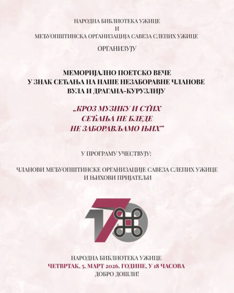 Memorijalno poetsko veče „Kroz muziku i stih sećanja ne blede, ne zaboravljamo njih”, posvećeno Vukomanu Vulu Tatoviću i Draganu Popoviću Kuruzliji, biće održano 5. martau 18 časova u Narodnoj biblioteci Užice.