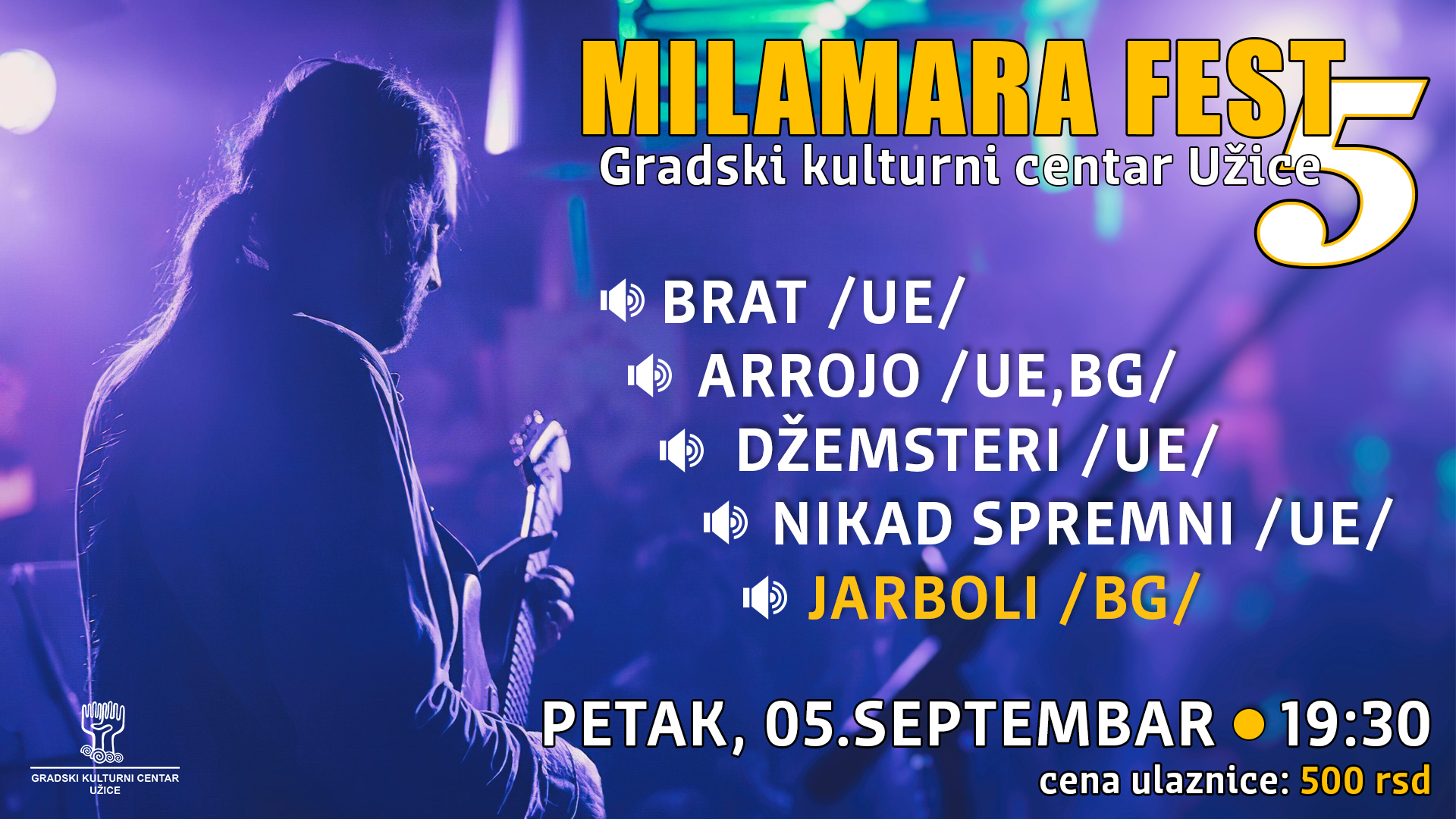 Milamara – muzički festival posvećen čoveku koji je čitav svoj život posvetio muzici – Milomiru Mišku Milosavljeviću, ove godine i ove večeri, od 19.30, okupiće sledeće bendove: Brat, Arrojo, Džemsteri, Nikad spremni i beogradski Jarboli.