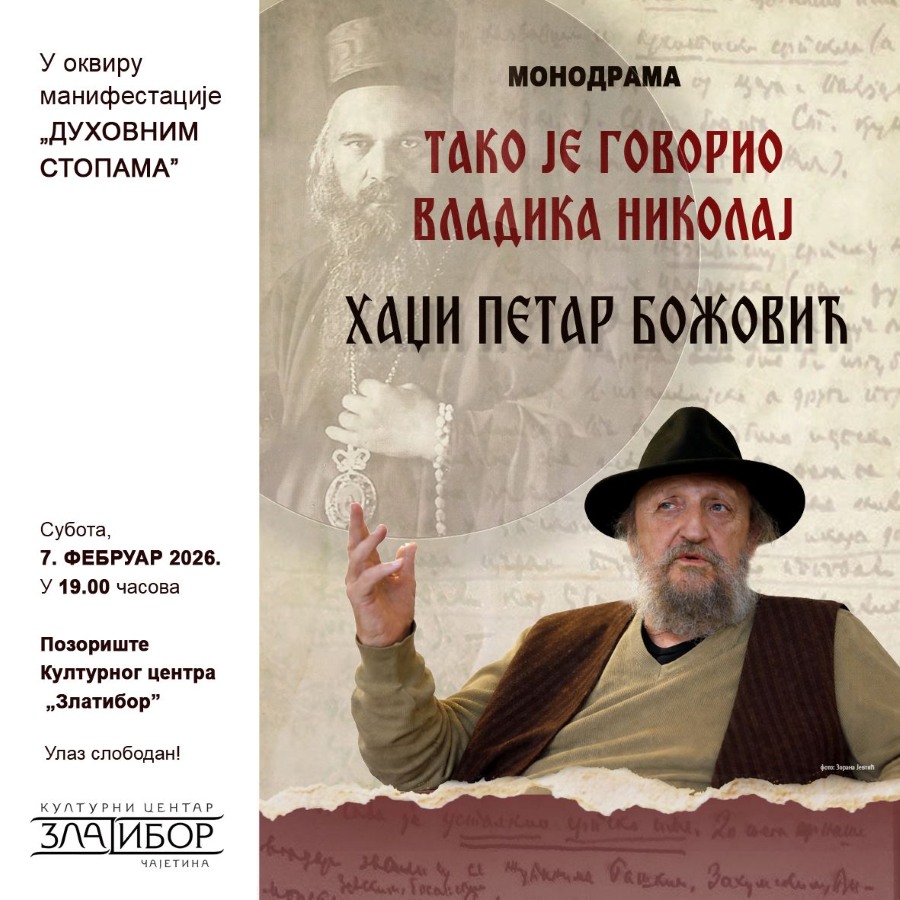 U subotu, 7. februara, u 19 časova, u okviru manifestacije „Duhovnim stopama” Hadži Petar Božović izvešće monodramu „Tako je govorio vladika Nikolaj”.