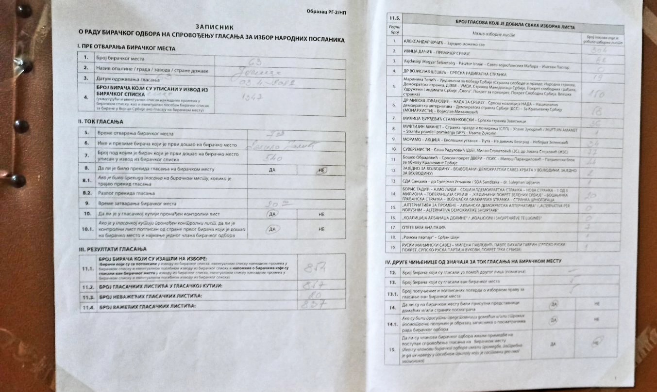 – Upoređivanjem Zapisnika o radu biračkog odbora za izbore za narodne poslanike i Zapisnika o radu biračkog odbora za izbore za predsednika Republike, može se zaključiti da je lokalna izborna komisija, na osnovu dogovora, unela podatak da je izašlo više birača nego što zaista jeste. Ukupan broj izašlih birača na predsedničke izbore na biračkom mestu broj 63 je 854 birača, napomenuli su iz koalicije Moramo.
