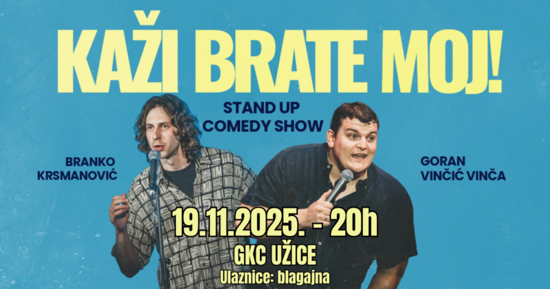 Goran Vinčić Vinča i Branko Krsmanović, dva potpuno različita komičara, ali obojica vole komunicirati s publikom – i ne samo to, njih dvojica su generacija, imaju isto godina, često se u međusobnoj konverzaciji zovu sa “brate” i neretko to stvarno misle! Njihov novi Stand Up Show “Kaži, brate moj!” biće premijerno izveden u Gradskom kulturnom centru u sredu, 19.novembra sa početkom u 20h. Ulaznice možete nabaviti na biletarnici Gradskog kulturnog centra po ceni od 1300 rsd.