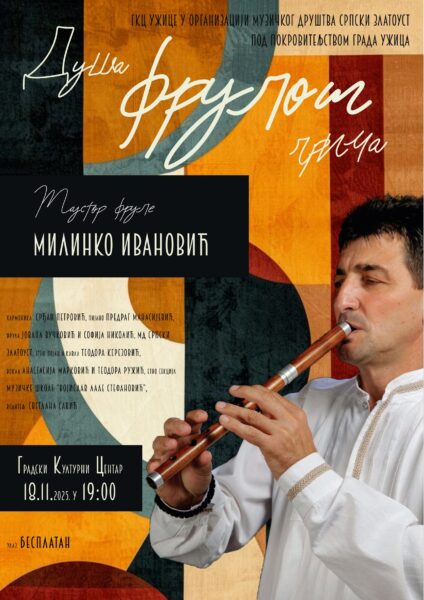 U organizaciji Gradskog kulturnog centra i muzičkog društva Srpski zlatoust, a pod pokroviteljstvom grada Užica u utorak 18.novembra biće održan muzički fesival ’’Duša frulom priča’’. Pored velikog broja učesnika iz grada i okoline, specijalni gost biće Milinko Ivanović, majstor frule. Početak programa zakazan je za 19h a za sve zainteresovane ulaz je slobodan.