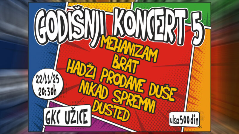 Za ljubitelje malo tvrđeg zvuka, peti po redu Godišnji koncert užičkih bendova na programu GKC-a je u subotu 22.novembra. Učešće ove godine uzeli su: Mehanizam, Brat, Hadži prodane duše, Nikad spremni i Dusted. Ulaznice mogu se kupiti na biletarnici po ceni od 500 rsd, a  početak koncerta je u 20:30h.