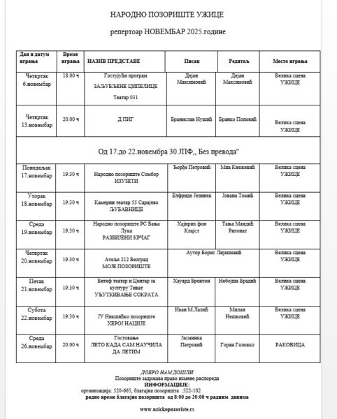 Ove godine nećemo imati ni jednu predstavu iz Republike Hrvatske. Napomenula bih da su predstave iz tri pozorišta (dve iz Zagreba i jedna iz Splita) bile u opticaju. Razlozi njihovog neučešća na JPF-u su zauzeća i tehničke prirode. Ipak, radujem se novom izdanju festivala i susretu sa pozorišnom publikom. Grad Užice voli Jugoslovenski pozorišni festival i velika je čast biti deo ove fantastične priče koja sa uspehom traje već trideset godina.
