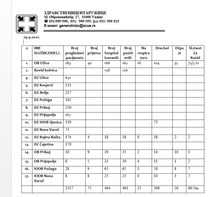 Na bolničkom lečenju u Zlatiborskom okrugu je 484 pacijenata, od kojih 461 ima korona virus kovid-19.