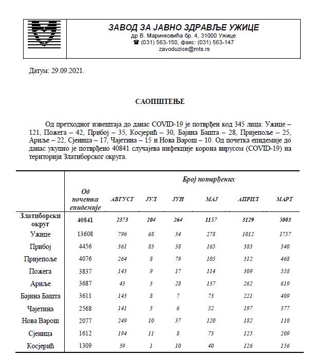 Korona virus kovid-19 je potvrđen kod 345 ljudi u Zlatiborskom okrugu, prema poslednjem izveštaju Zavoda za javno zdravlje Užice, dok je juče, podsetimo, bilo 455 novoobolelih.