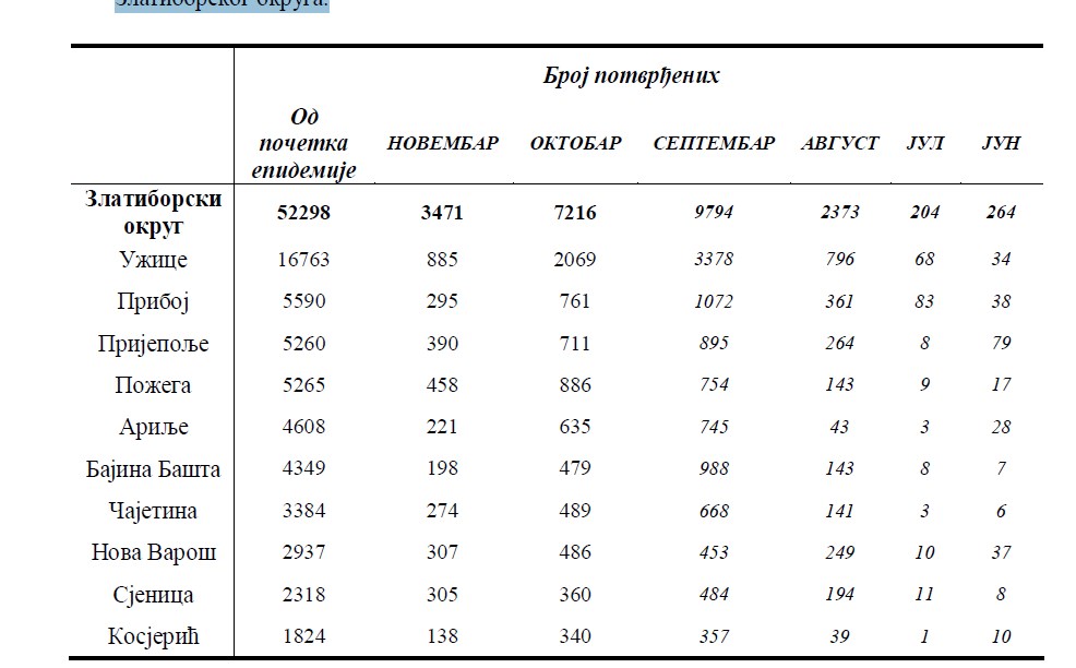Prema podacima ZZJZ, Užice ima 11 novoobolelih, Priboj – 6, Čajetina, Nova Varoš, Prijepolje i Požega po pet novih potvrđenih slučaja kovid-19. U Sjenici su tri novoobolela potvrđena za 24 sata, Arilje, Bajina Bašta i Kosjerić imaju po dva nova potvrđena slučaja korona virusa kovid-19.