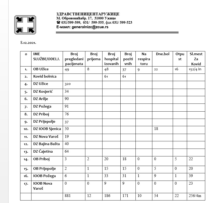 Porastao je broj životno ugroženih. Na respiratoru u bolnicama u Užicu i Požegi je ukupno deset pacijenata, dok je prethodnog dana na respiratoru bilo sedam ljudi.