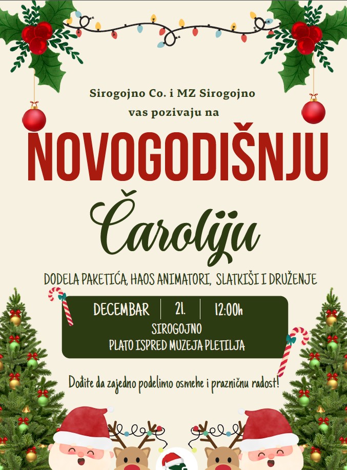 Novogodišnje čarolije za decu iz Sirogojna, Ljubiša, Rožanstva, kao i za mališane naših zaposlenih iz firme Sirogojno Co. doo Sirogojno sa svih šest lokacija (Užice, Požega, Bajina Bašta, Dobrinja..) biće održane 21. decembra u podne, na platou ispred Muzeja Pletilja u Sirogojnu.