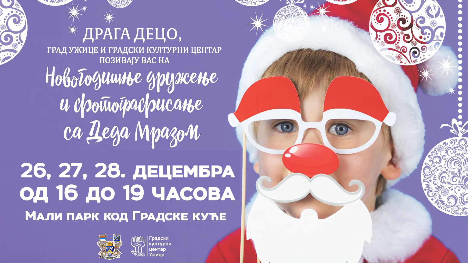 Gradski kulturni centar i Grad Užice pozvali su decu iz Užica na novogodišnje druženje i fotografisanje sa Deda Mrazom u petak, subotu i nedelju (26. 27. i 28. decembra) u periodu od 16 do 19 časova u Malom parku.