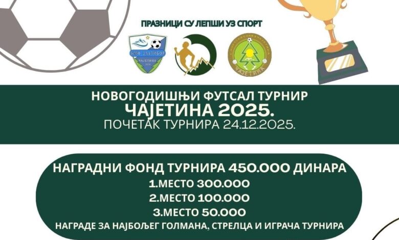 Novogodišnji futsal turnir Čajetina 2025 u Čajetini počinje 24. decembra.. Ovogodišnje izdanje donosi atraktivan nagradni fond od 450.000 dinara, koji će biti raspoređen na tri najbolje ekipe: