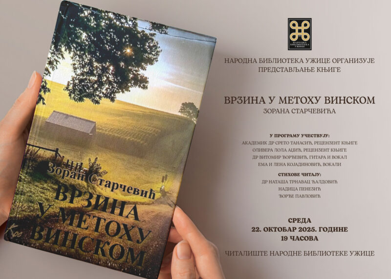 Knjiga „Vrzina u Metohu vinskom”, autora Zorana Starčevića, biće predstavljena 22. oktobra u u Čitalištu Narodne biblioteke Užice, od 19 časova.