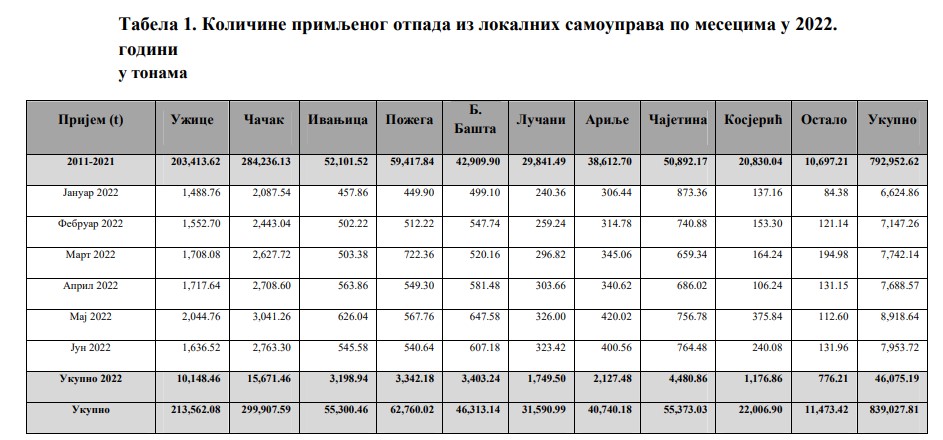 Prema podacima JKP Duboko Užice, iz informacije o šestomesečnom poslovanju javnih preduzeća koju će razmatrati odbornici Skupštine grada Užica na 20. sednici 28. septembra, ukupno 4,480.86 tona otpad sa teritorije Čajetine je dopremljeno u Regionalni centar za upravljanje otpadom Duboko u Užicu tokom prvih šest meseci ove godine.