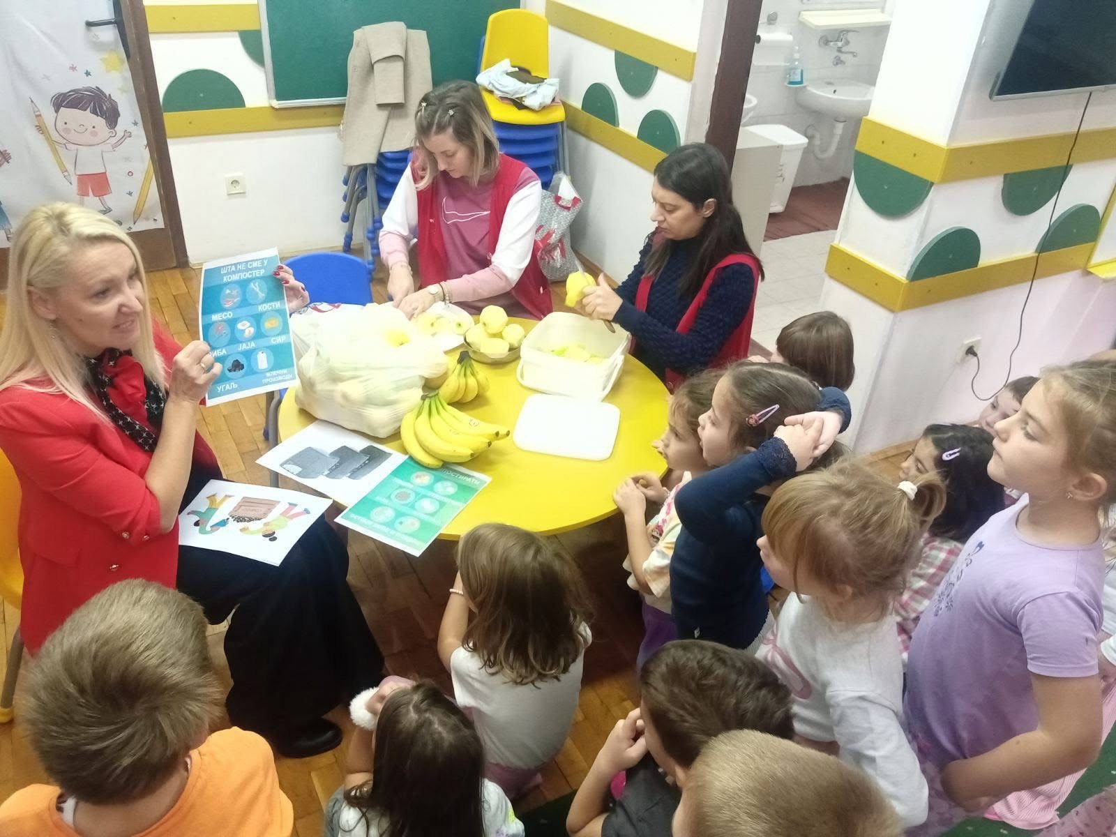 Na kraju druženja, kao simboličan podsticaj da nastave da razvijaju ekološku svest, mališanima su uručene jabuke, banane i eko bojanke.