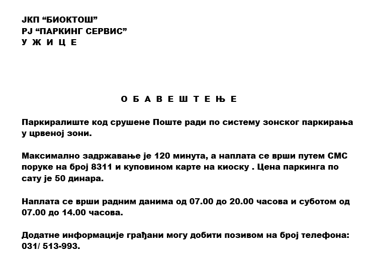 Užičke Republike, Koštička, Hercegovačka, Gradska, Ive Andrića, Stanoja Glavaša, Miloša B.Jankovića, Isidore Sekulić, Đačka, Dušana Popovića, Šarganska, Terazije, Miloša Parovića, Radničkog Bataljona, Vuka Karadžića i krak, Krcunova, Ustanička, 1300 Kaplara i Vojislava Ilića .
